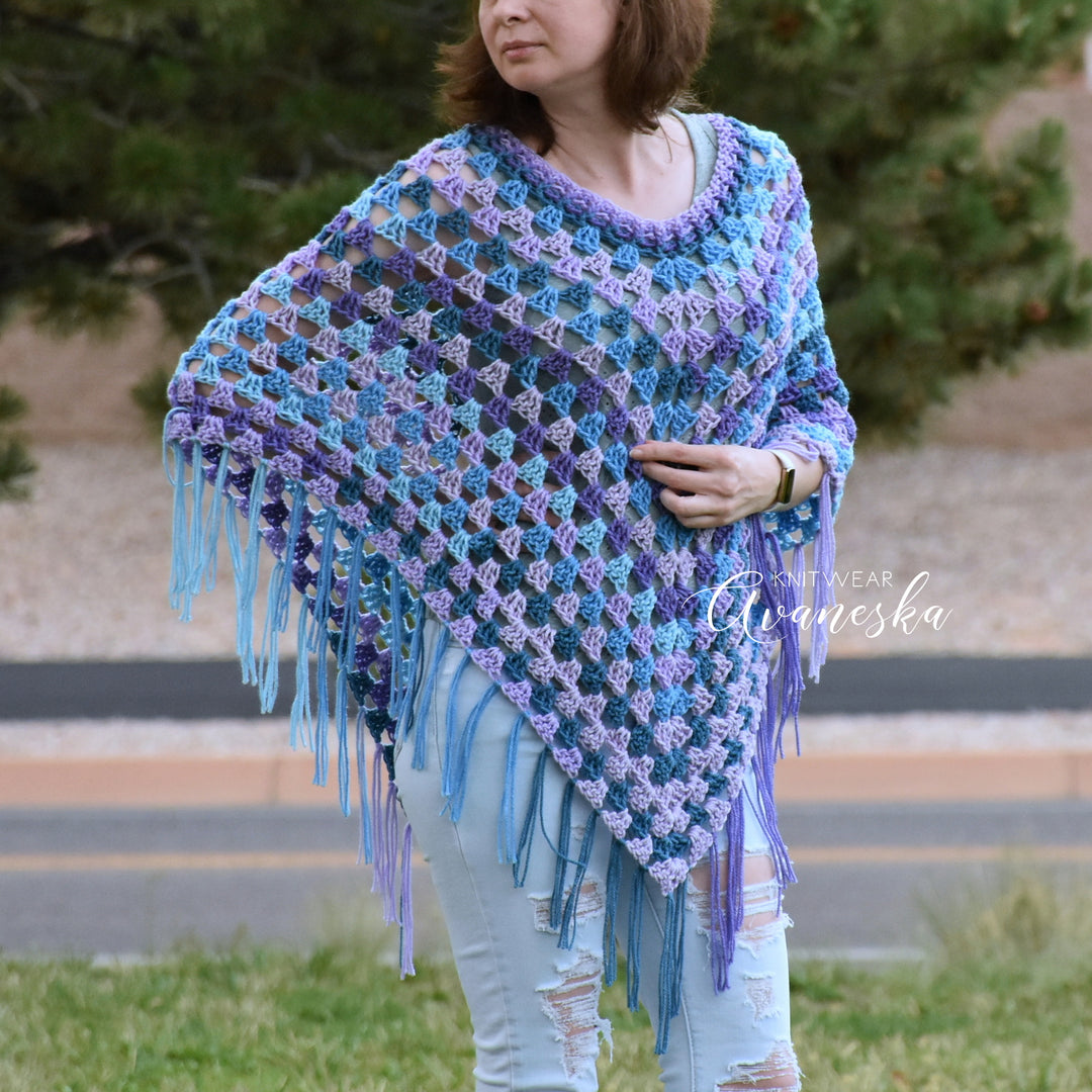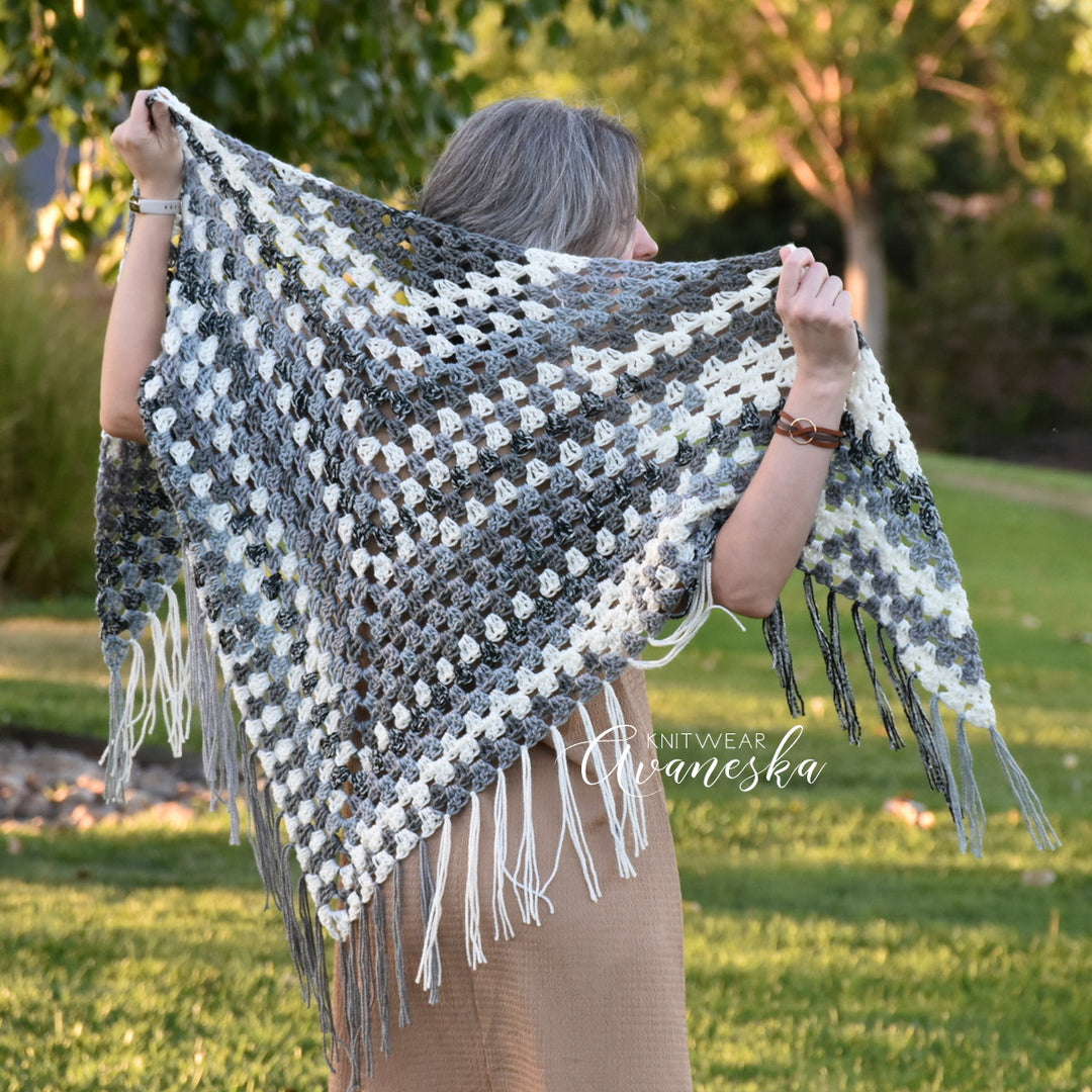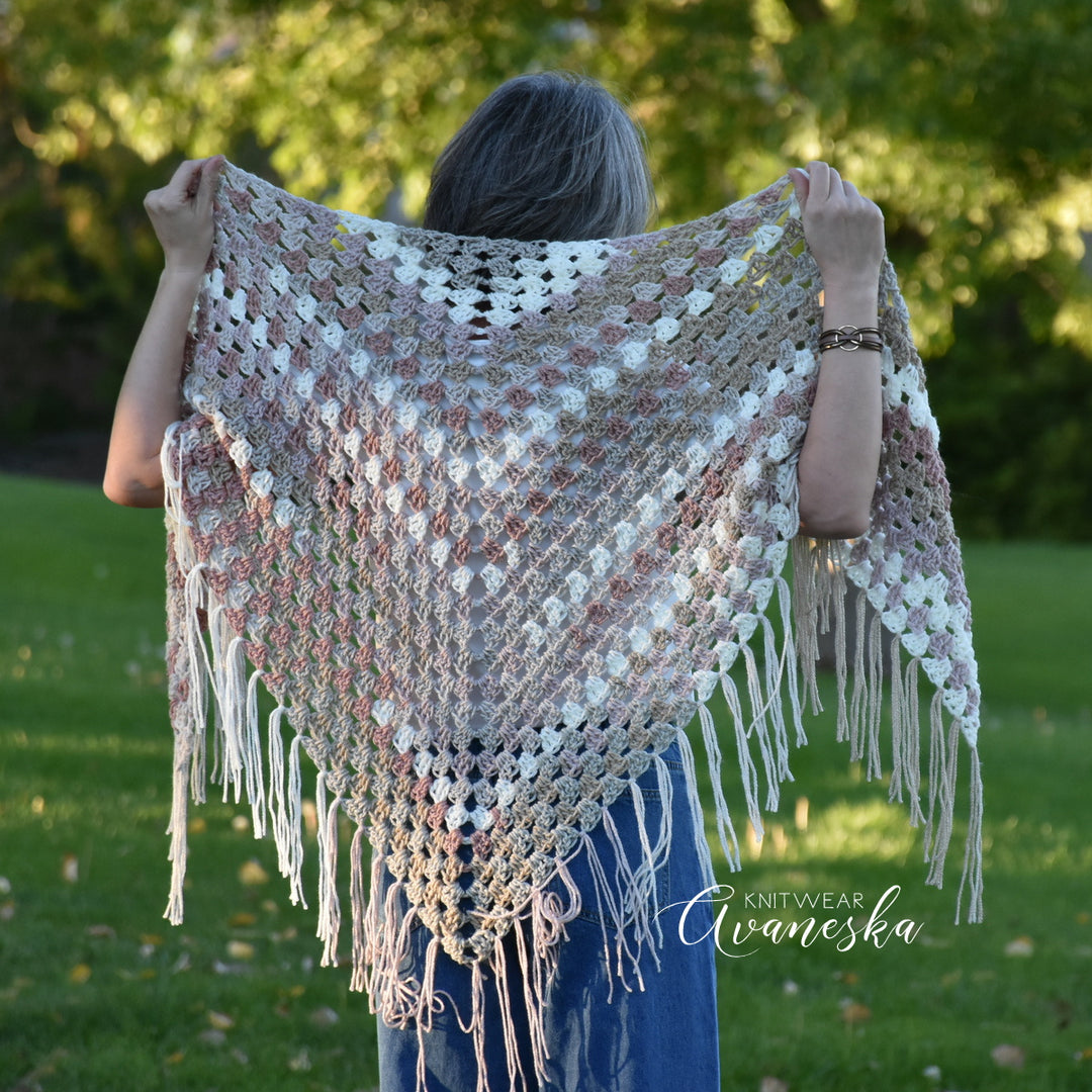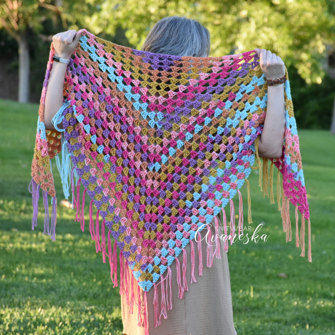 NOTE: Colors may be positioned in a different order on each finished shawl, due to the difference in yarn dye lots